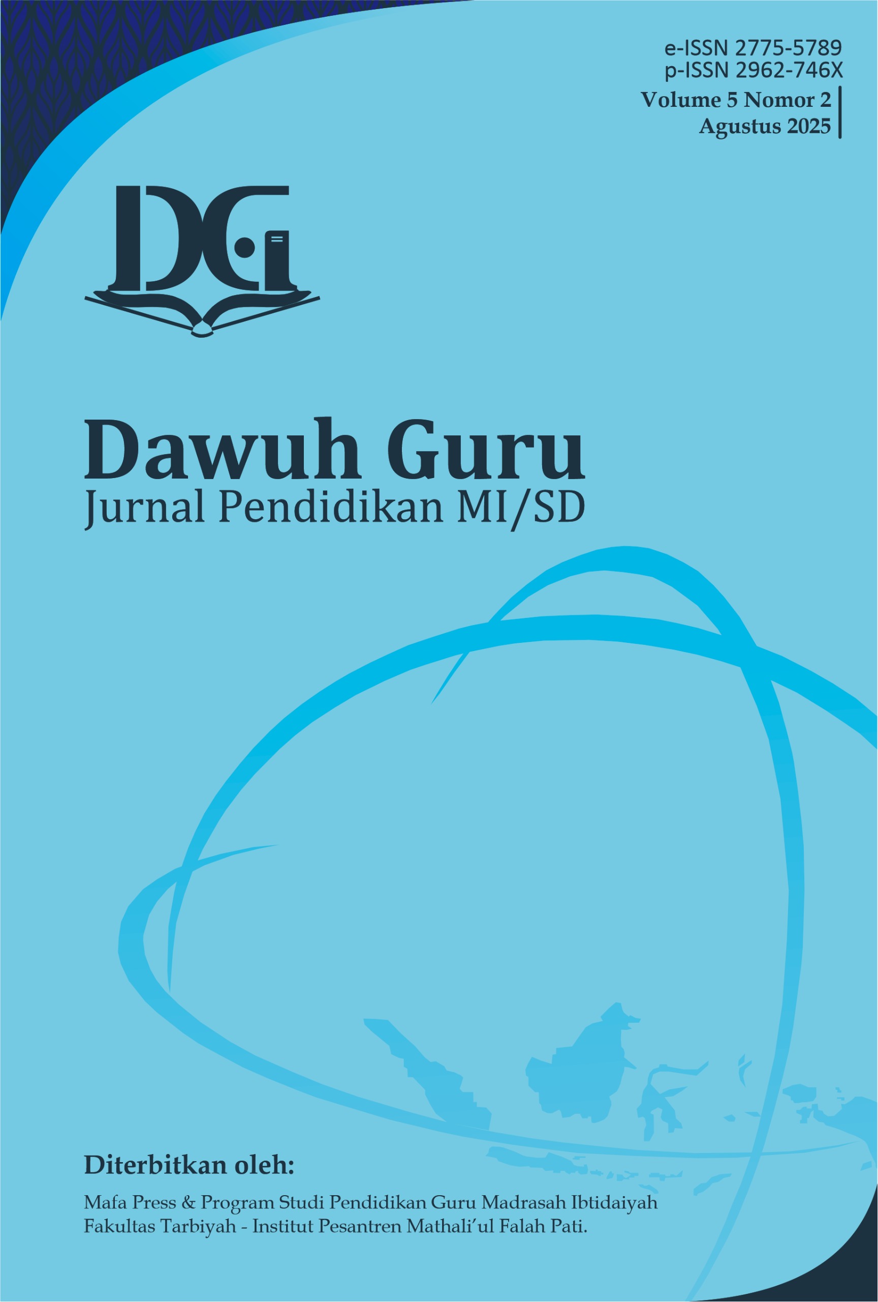 Dawuh Guru:  Jurnal Pendidikan MI/SD is published by Department of Madrasah Ibtidaiyah Teacher Education, Faculty of Tarbiyah, Institute of Pesantren Mathali'ul Falah Pati in collaboration with Indonesian Islamic Elementary Education Lecturers Association (Perkumpulan Dosen PGMI Indonesia). Publishing twice a year, in February and August.