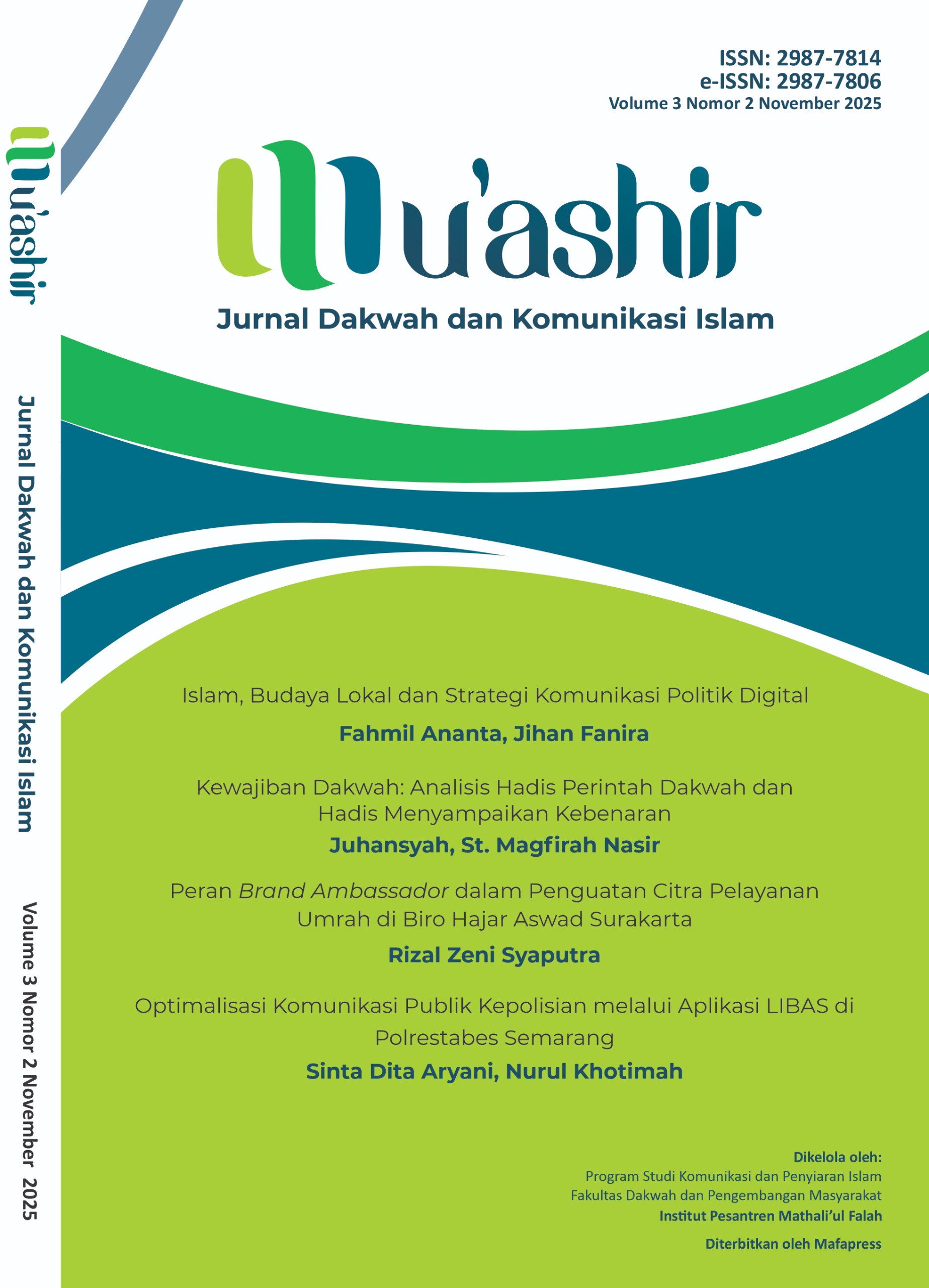 Mu'ashir: Jurnal Dakwah dan Komunikasi Islam is a scientific journal published by the Islamic Communication and Broadcasting Study Program, Faculty of Da'wah and Community Development, Institut Pesantren Mathali'ul Falah (IPMAFA). The journal, which is published twice a year (May and November), is dedicated to the publication of research results and studies on da'wah and Islamic communication. Mu'ashir: Jurnal Dakwah dan Komunikasi Islam becomes a means of disseminating the results of quality research and studies on Islamic Da'wah and Communication.